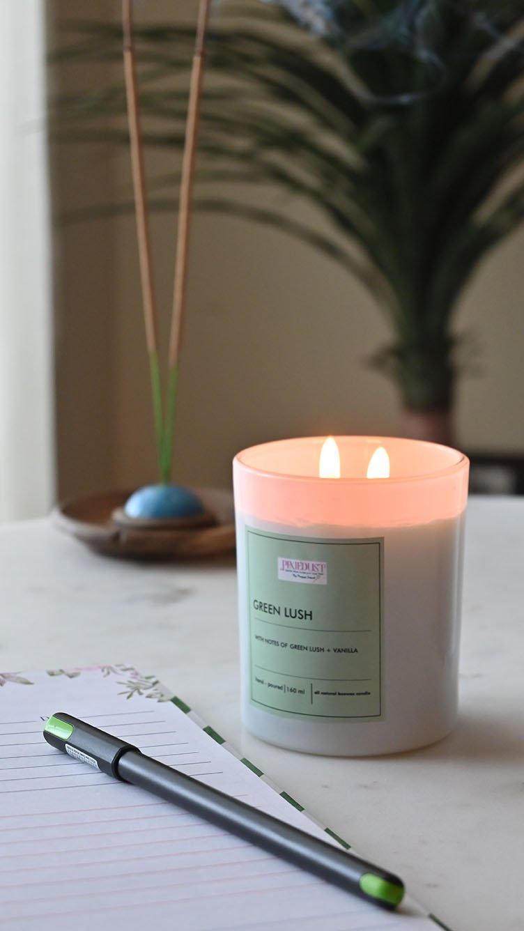Green Lush β A perfect blend of fresh greens like Cucumber, Mint, Vetiver, thyme and basil fragrances with a dash of Vanilla makes you feel happy, fresh, luscious and prosperous!!