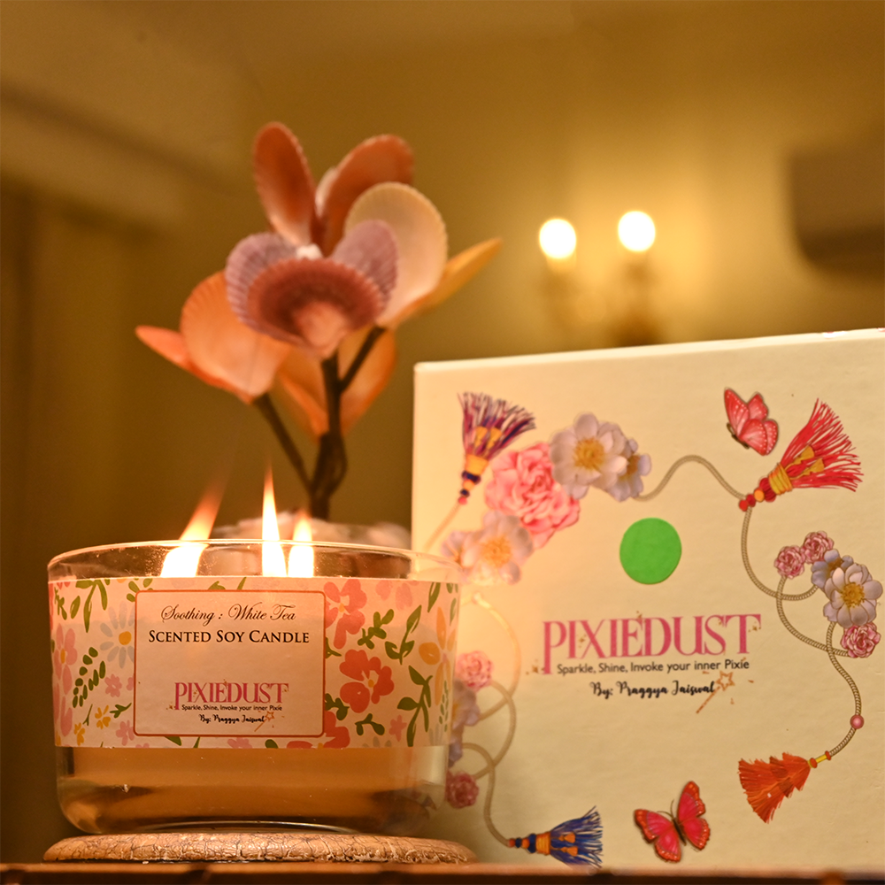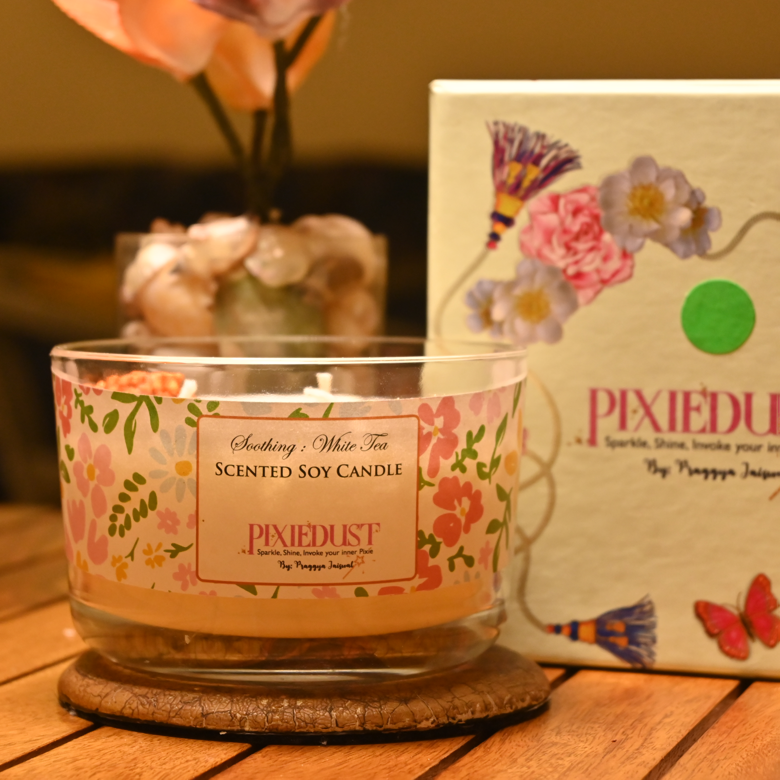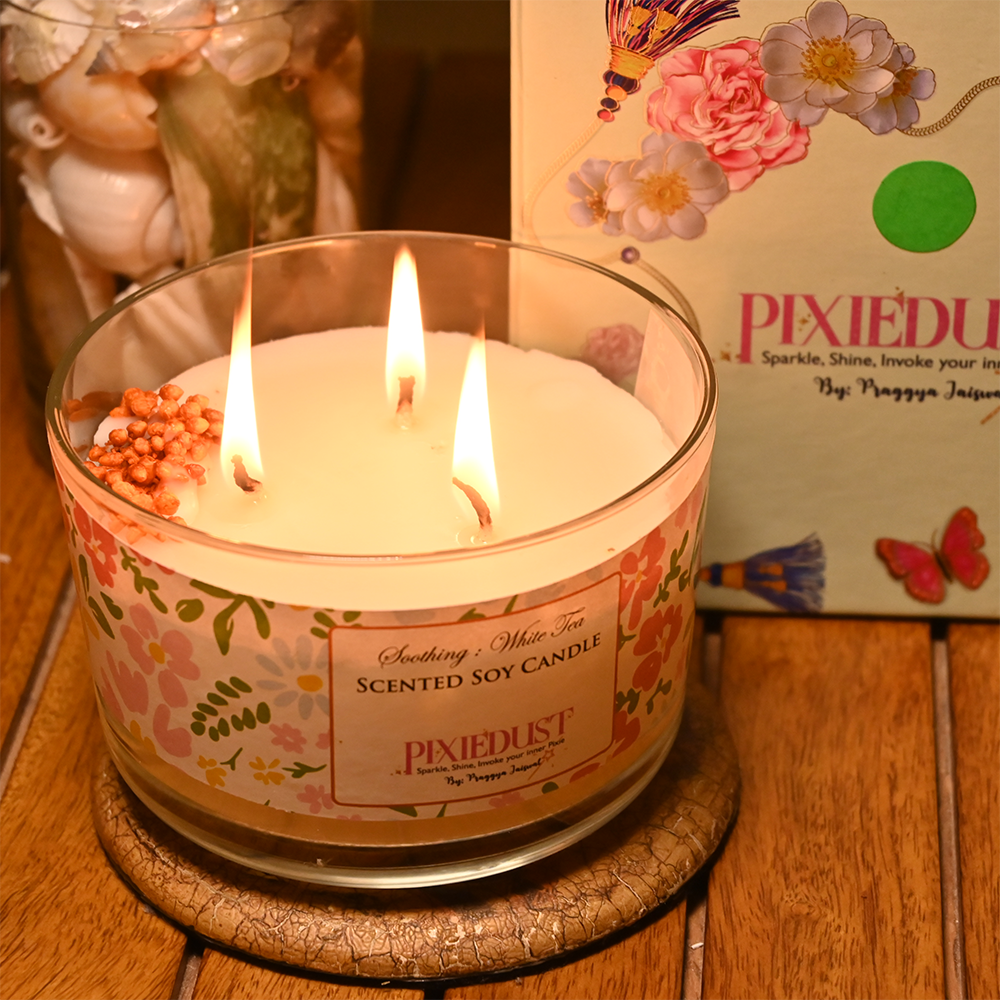 Elevate your senses with a refreshing, airy, and inviting aroma in your home & office spaces with our 220 ml, 3-Wick WHITE TEA Fragrance Handcrafted Soy Candle. Burn time: 48 Hrs